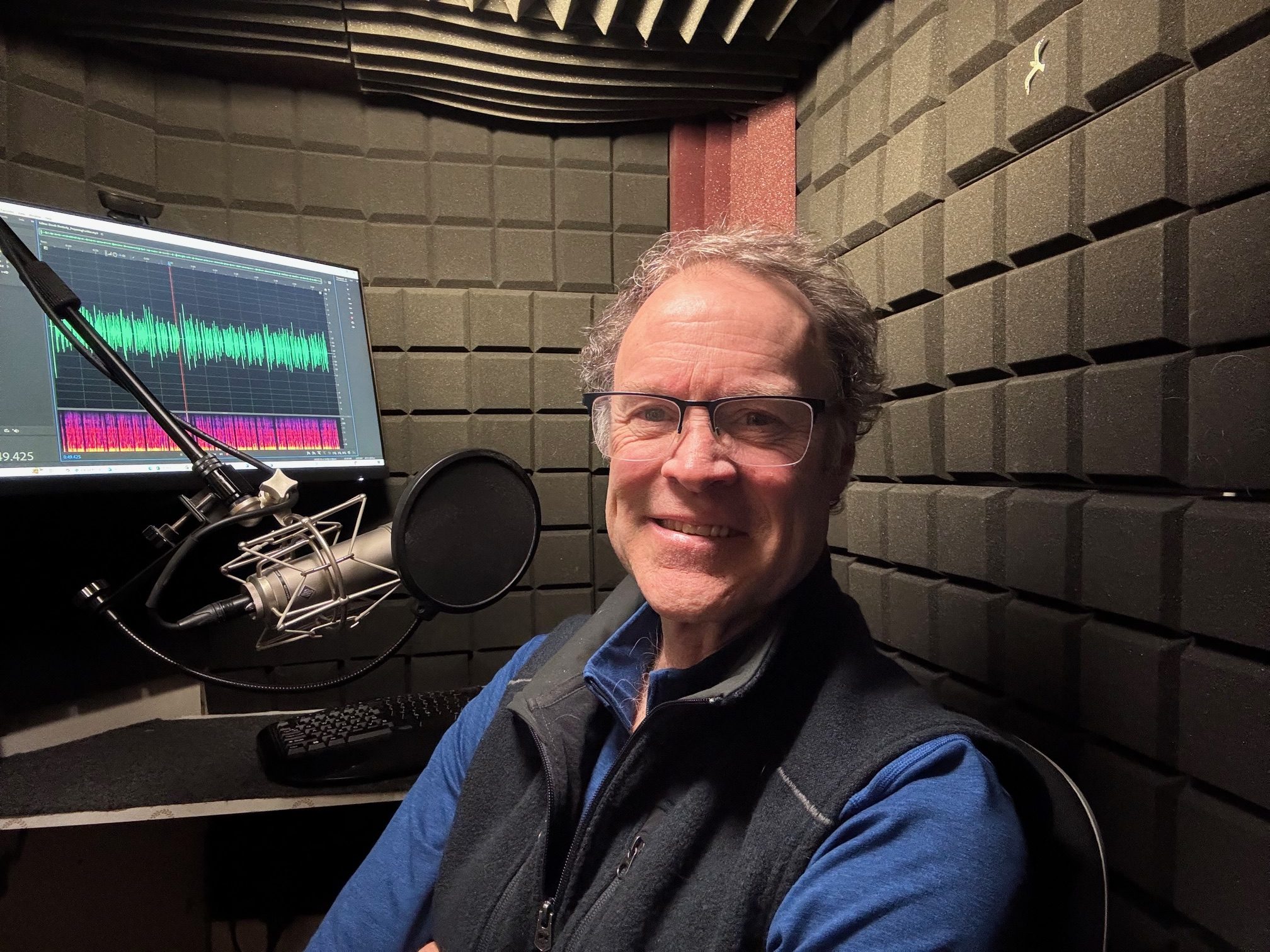 Derek is working inside a custom-built voice booth crafted with solid oak and pine, organic cotton fiber batting, mass loaded vinyl, SSP green tape, staggered studs & 2” Auralex foam padding.